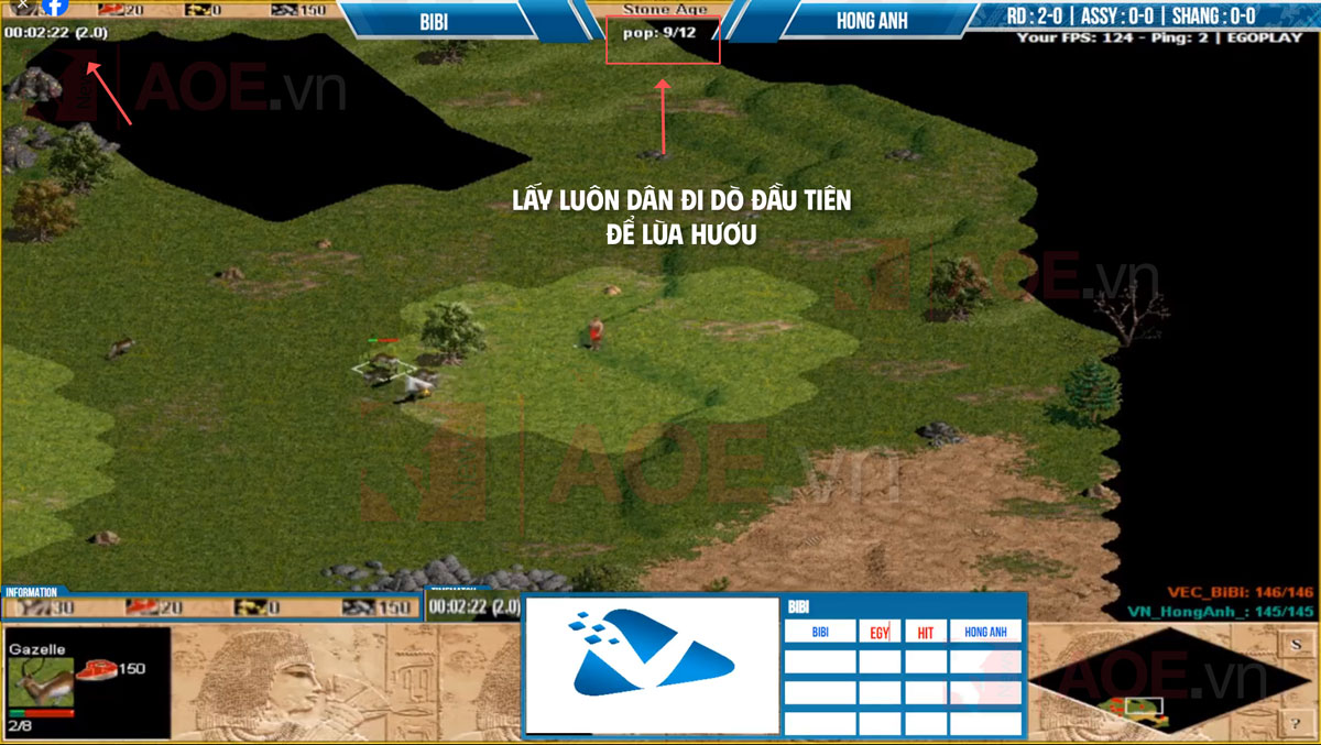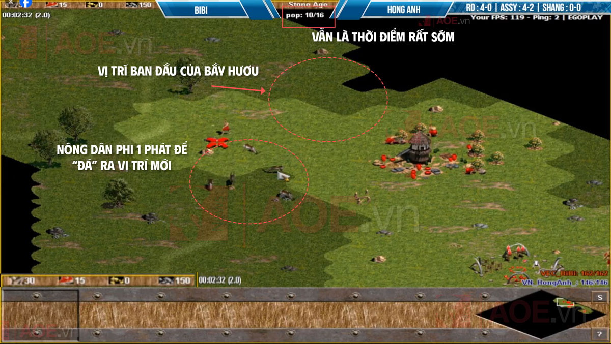 Đây là một bãi hươu bị chắn bởi mỏ quả đầu, đã được BiBi lùa ra một vị trí vô cùng thông thoáng. Ở trường hợp này, đa số các game thủ sẽ tiếp tục dùng 1 dân lùa vì khoảng cách đến Nhà chính không còn quá xa, và đường đi khá đẹp rồi