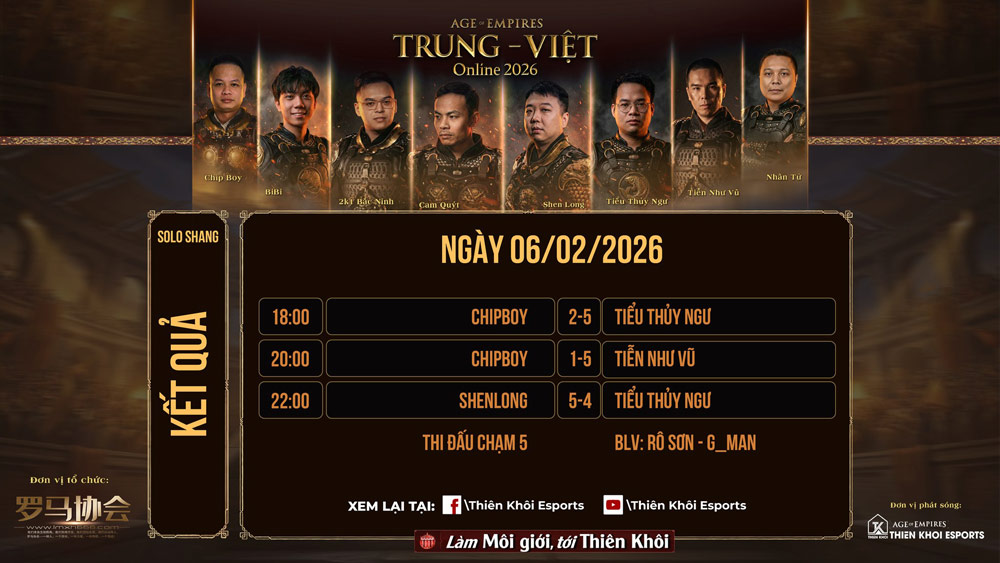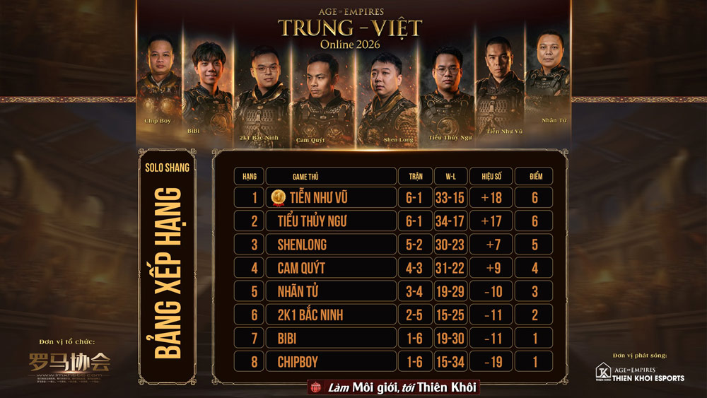 Tuy nhiên, với thể thức vòng tròn tính điểm của AoE Trung Việt Online 2026, cục diện đã hoàn toàn thay đổi. Tiễn Như Vũ dù gặp khó ở lượt ra quân khi đụng độ với Tiểu Thủy Ngư và nhận thất bại 3-5. Nhưng phần còn lại là lịch sử với 6 trận toàn thắng, trong đó có chiến thắng rực rỡ 5-1 trước Shenlong.